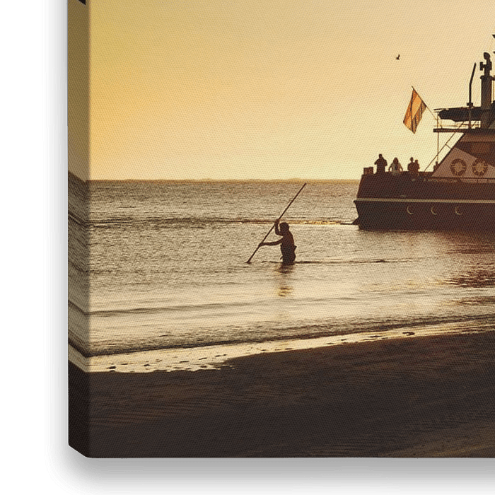 Een demonstratie van de paardenreddingboot op Ameland tijdens een zonsondergang.