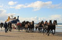 Tijdens de demonstratie van de paardenreddingboot op Ameland trekken 10 stoere paarden de reddingboot met donderend geweld over het strand en door de branding in zee.