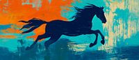 Een majestueus paard galoppeert met sierlijke bewegingen over een achtergrond van levendige blauwe tinten en fel oranje. De dynamische compositie straalt vrijheid en energie uit, terwijl de kleurcontrasten het gevoel van ruimte en beweging versterken. Perfect voor de woonkamer, waar het inspiratie en levendigheid uitstraalt.