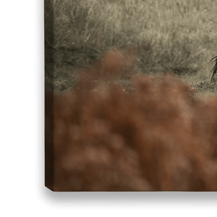 Twee paarden rijzen op hun achterbenen in een explosief duel, gevangen in een moment vol spanning, kracht en natuurlijke pracht. Omgeven door een herfstachtig landschap met warme roest- en goudtinten, weerspiegelt dit beeld de ongetemde energie van het dierenrijk. Hun gespierde lichamen, opbollende manen en intense oogcontact vertellen…