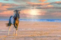 Paardje op het strand painting stijl in de avond. Laag hangende zon en een gemoedelijke zachte sfeer.