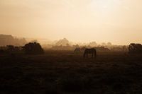 In het gouden licht van de opkomende zon, de silhouetten van twee paardjes.