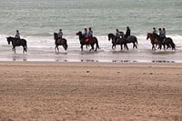 Ruiters / amazones op paarden in galop door het opspattende water van de golven en branding. Strand (Noordzeestrand), Hoek van Holland.