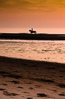 Paardrijden op het strand in Wassenaar tijdens zonsondergang. Sfeervolle en warme zomerse strandfoto met in de verte een ruiter op het paard. Op de voorgrond ziet u het strand met zeewater dat tijdens vloed binnenstroomt.