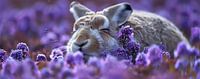 Het kunstwerk toont een close-up van een schattige sneeuw haas die rustig slaapt in een weelderige weide vol paarse bloemen, waarschijnlijk lavendel.