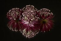 "Paars - oud roze Zeeuwse Knoopje met 3 Zeeuwse knoopjes op de achtergrond"  is een macrofoto van een Zeeuws knoopje  (Astrantia Major) dat op een spiegelend oppervlak ligt. Hierdoor reflecteert het bloemetje aan de onderzijde en krijg je een verrassend beeld. Op de achtergrond van dit Zeeuws knoopje, liggen nog 3 Zeeuwse knoopjes, deze zijn vaag, de voorste is scherpt en daar valt het meeste licht op.