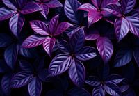 Een close-up toont een dichte tros paarse en donkerblauwe, vijfbladige planten tegen een zwarte achtergrond, die hun textuur en kleurvariaties benadrukt.