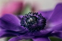 Macrofoto van een paarse Anemoon waarbij gefocust is op het hart met de stampertjes van de Anemoon.