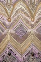 Dit werk toont een serene weergave van bergen in zachte paarse en aardetinten. De gelaagde patronen en fijne texturen geven het een rustgevende uitstraling, terwijl de symmetrische lijnen een gevoel van orde en balans creëren. De combinatie van paarse, beige en gouden accenten brengt een subtiele elegantie naar voren, die elke ruimte op een ingetogen manier kan verrijken. Perfect voor wie houdt van rust en natuurlijke patronen in hun interieur.