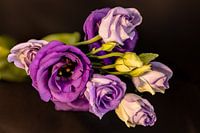 Een stilleven met een mooi paars bloemenboeket, gefotografeerd tegen een donkere achtergrond.