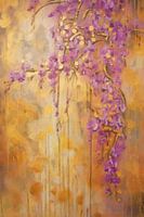 "Paarse Klimop" is een verfijnd werk dat de schoonheid en elegantie van klimplanten vangt. Met een kleurenpalet van zachte goudtinten en levendige paarse bloemen, straalt dit werk een gevoel van rust en natuurlijke pracht uit. De delicate bloemen en de sierlijke lijnen van de klimplant creëren een harmonieus en sereen beeld.