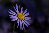 "paarse aster in de zon op de voorgrond, op de achtergrond zie je vaag de andere herfstasters.