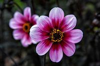 Foto van een paarse bloem, een dahlia. Foto is van boven uit gefotografeerd, zodat he zicht krijgt op de kern, stuifmeeldraadjes en de bloemenblaadjes. Bloemenblaadjes zijn paars en wit, hoe meer naar de kern van de bloem, hoe paarser. In de achtergrond die onscherp is zie je nog een tweede bloem.