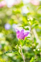 Deze prachtige foto toont een paarse bloem die gloeit in het zachte zonlicht. De natuurlijke belichting en zachte achtergrond laten de bloem in volle pracht bloeien. Perfect voor liefhebbers van bloemen en natuurfotografie die de schoonheid en delicatesse van tuinbloemen waarderen. Deze foto brengt een vleugje natuur en kleur in elk huis.