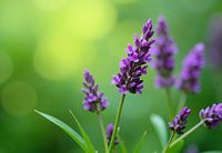 Close-up van verschillende paarse bloeiende planten met slanke stengels en groene bladeren tegen een onscherpe groene achtergrond. De focus is het scherpst op de centrale bloemtak.