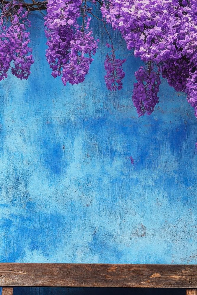 Hier ontvouwt zich een droomachtig kleurenspel: De felpaarse bloemenplanten lijken de serene blauwe tinten van de muur te omarmen, terwijl een rustieke houten bank uitnodigend op de voorgrond staat. Deze harmonieuze achtergrond is als een geheim toevluchtsoord dat verhalen van ontspanning en inspiratie belooft.