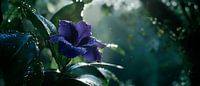 Een betoverend samenspel van dieppaarse en groene tinten ontvouwt zich, terwijl een majestueuze bloeiende held glinstert in de mist. Druppels ochtenddauw dansen op de bladeren en geven het tafereel levendigheid. Dit beeld vangt de essentie van de natuur en is perfect voor een woonkamer die rust en inspiratie wil uitstralen.