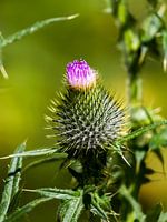 De prikkelbare distel houdt tussen zijn stekels een prachtig gekleurde bloem verborgen. Goed beschermd tegen de grote wereld krijgt de bloem zo de kans om te bloeien en een plekje in de natuur te veroveren.