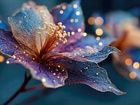 Close-up van een delicate, doorschijnende bloem met glinsterende blauwe en violette bloemblaadjes, bezaaid met gloeiende gouden lichtjes, die een magische, etherische sfeer creëren