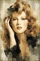 Het portret toont een vrouw met een sierlijke houding, rood golvend haar en een sensuele blik - een icoon van klassieke Hollywood-schoonheid. De stijl is geïnspireerd op Andy Warhol, met een lichte abstractie en schilderachtige textuur die doet denken aan smeltende kleuren. Warme tinten van goud, koper, ivoor en zacht bruin domineren…