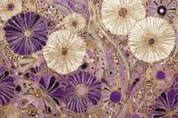 Dit werk toont een arrangement van paarse en witte bloemen die de hele compositie vullen. De bloemen zijn gedetailleerd met kleine stippen en lijnen, wat een rijk patroon vormt. De achtergrond bestaat uit vloeiende, golvende lijnen en zachte kleuren die de bloemen omlijsten en een harmonieuze sfeer creëren.
