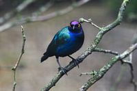 Kleurrijke paarse glanzende spreeuw in een boom, kijkend richting camera.