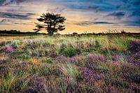 Een natuurbeeld van bloeiende paarse heide in het duin bij een zonsopkomst. Een Hollands duinlandschap in de vroege ochtend met heide en een naaldboom.