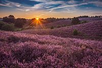 De karakteristieke heuvels van de Posbank tijdens de laatste momenten van de zonsondergang in de Veluwezoom, met de paarse heide in volle bloei. De foto is zo gemaakt dat de zonnestralen in stervorm weergegeven worden.