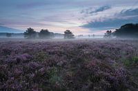 Een vroege ochtend nog voor zonsopkomst op de Rucphense heide in Brabant. Met een laag ochtendnevel na een heldere nacht en de heide die vol in bloei staat.