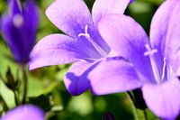 Ik heb deze macrofoto in de tuin gemaakt, ik kon het zo van het terras maken. Deze paarse klokjesbloem staat namelijk naast het terras in de zon. Toen ik de foto maakte was het begin van de zomer. Het is wel een tuinplant die in de zomer vol met bloemen komt. Helaas zat er geen vlieg of bij op deze tuinplant ook al wat het wel leuk geweest.