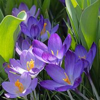 De eerste krokussen hebben zich een weg gebaand tussen de tulpen en bloeien in paarse kleuren. Een eerste lentegroet...