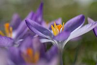 In februari bloeit de eerste paarse krokus en schittert in de zon. Het licht schijnt fel op de open bloemblaadjes. Het stuifmeel steekt geel af. De vroege bloeier belooft het einde van de winter.