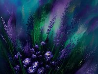 Een digitaal schilderij in abstracte stijl van een boeket paarse lavendel. De achtergrond heeft bijpassende donkere kleuren, blauw, groen en paars en doet denken aan het noorderlicht.