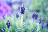 Levendige paarse lavendelbloemen domineren de voorgrond tegen een soft-focus achtergrond van groen en bloemen. De afbeelding vangt de natuurlijke schoonheid en delicate structuur van de lavendelkruid in een tuin.