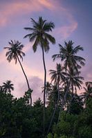 Paarse lucht tijdens zonsondergang op een tropisch eiland met heel veel palmbomen op de Malediven in de Indische oceaan. Een waar paradijs!