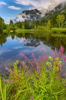 In de glooiende weiden van de Oberallgäu, in de buurt van Oberstdorf, opent zich een schilderachtig schilderij van de natuur, vastgelegd in één enkel moment. Het hart van deze poëtische foto klopt op het ritme van de bloeiende paarse losblad, ook bekend als Lythrum salicaria. In een elegante dans strekken de robijnrode bloemkaarsen zich uit naar de zon, alsof ze een tedere band vormen met de laatste stralen van de dag.