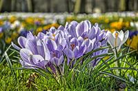 Krokussen, de voorboden van de lente, zijn vaak geel, wit of paars. Dit is een bijzondere variant, met paars-wit gestreepte bladeren die mooi contrasteren met de felgele stampers binnenin de bloem.