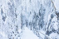 Besneeuwde loopbrug door het Wildsee-veen in het natuur- en bosreservaat Kaltenbronn in de winter. Het natuurreservaat omvat het Wildsee-meer en het Wildseemoor, het grootste hoogveen in het Zwarte Woud. Geografisch gezien ligt het veen bij Kaltenenbronn tussen Gernsbach en Bad Wildbad, Zwarte Woud, Baden-Württemberg, Duitsland.