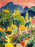 Een levendig, op Fauvist geïnspireerd landschap dat barst van de gedurfde penseelstreken, contrasterende kleuren en expressieve energie. Het kronkelende pad leidt het oog door weelderig groen, vurige bloesems en majestueuze bergen onder een stralende hemel.