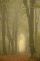 Pad door de Magische Ochtendnevel Bos met zonlicht aan het eind van het pad dat door de bladeren schijnt in het Speulderbos in het Veluwse natuurreservaat.