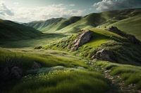 Dit serene landschap bestaat uit glooiende heuvels met weelderig groen gras dat zich uitstrekt tot de horizon onder een zachte wolkenlucht. Verspreide rotsen voegen natuurlijke textuur en contrast toe, terwijl een kronkelend pad het oog van de kijker door het serene en levendige landschap leidt. Ideaal voor wie op zoek is naar een…