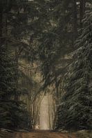 Pad door de dennenbomen in het Speulderbos in het natuurgebied de Veluwe, Gelderland. Er ligt wat sneeuw op de dennen en een beetje mist in de verte tijdens deze koude winterochtend.
