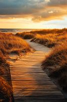Een schilderachtig houten pad slingert zachtjes door gouden duinen die gloeien in het warme licht van de ondergaande zon. Het zachte geluid van de zee op de achtergrond vult de lucht terwijl de wolken mysterieus langs de hemel drijven. De zachte golven van het gras omlijsten het pad en nodigen je uit voor een ontspannen wandeling langs…