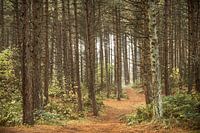 Slingerend pad door een donker dennenbos met mist in de achtergrond op het eiland Schiermonnikoog in de Waddenzee.