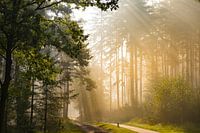Pad door een beuken- en dennenbos tijdens een mistige herfstochtend met zonlicht dat door de bladeren schijnt. Het pad verdwijnt in de verte. De mist en de zonnestralen geven het bos een mystieke en magische sfeer.