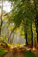 Beukenboslandschap tijdens een mistige herfstochtend. De bosgrond is bedekt met bruine gevallen bladeren terwijl er zonneschijn door de groene bladeren op de bomen komt.