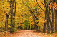 Pad door een beukenbos met gouden en gele bladeren tijdens de herfst. Het pad verdwijnt in de verte bij het natuurgebied Loenermark op de Veluwe in Gelderland.