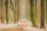 Bospad door een beukenbos tijdens een mistige winterochtend in het Speulderbos op de Veluwe. De bosgrond is bedekt met bruine gevallen bladeren en het pad verdwijnt in de verte. De mist geeft het bos een desolate en deprimerende sfeer.