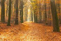 Pad door een goudkleurig bos tijdens een mooie zonnige herfstdag De bosgrond van het Speulder- en Sprielderbos in natuurgebied de Veluwe is bedekt met bruin en geel gevallen blad en het pad verdwijnt in de verte. Het zonlicht en de mist geven het bos een prachtige herfstsfeer.