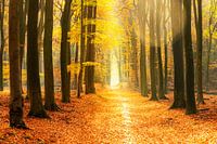 Pad door een goudkleurig bos tijdens een prachtige zonnige herfstdag De bosgrond van het Speulder- en Sprielderbos op de Veluwe is bedekt met bruin en geel gevallen bladeren en het pad verdwijnt in de verte. De mist geeft het bos een desolate sfeer.